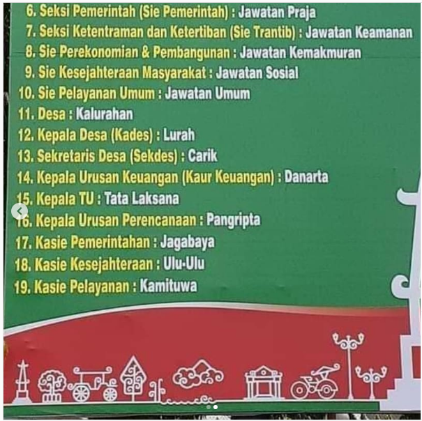 Istilah2 lain yang dulu biasa dipakai bahkan hingga 70an seperti Mas Mantri, Carik, Kamituwa dan lain2 menghilang ketika istilah nasional diterapkan di bekas wilayah Mataram seperti Kades, Sekdes dll.