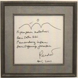 “Aku tidak dapat menahan diri mengutarakan pendapatku mengenai kegiatan terakhir itu. Dalam bidang sastra, di bagian dunia mana pun, secara tersebar orang tidak hanya menyajikan bacaan puisi. Semua kreasi sastra, termasuk novel dan cerita pendek, bahkan fragmen atau penggalan drama pun disuguhkan pada saat-saat pertemuan gelaran karya. Bahasa internasionalnya readings. Tapi di Indonesia, tidak pernah terjadi hal itu. Selalu deklamasi sajak, pembacaan puisi-lah yang menjadi ‘obsesi’ panitia penyelenggara kegiatan pertemuan-pertemuan kesenian. Entah ini disebabkan karena mereka kurang menaruh perhatian terhadap novel, cerita pendek dan drama, ataukah karena mereka picik, tidak mengetahui bahwa genre atau jenis-jenis ciptaan dalam sastra juga sangat dihargai di luar negeri.” (halaman 86).