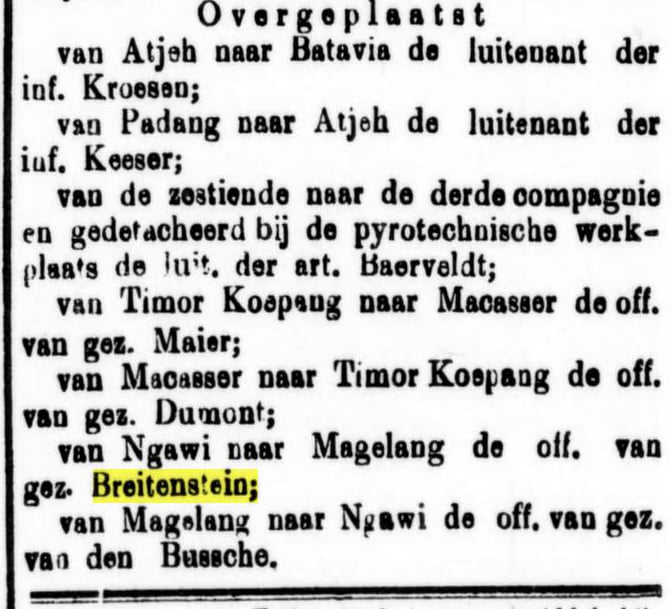 Berita mutasi dokter Breitenstein dari Ngawi ke Magelang yang tertera di Soerabaijasch handelsblad 13-10-1891