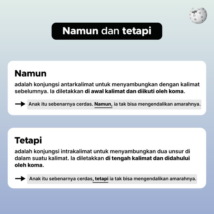 Kata sambung namun, tetapi, dan tapi digunakan untuk menunjukkan pertentangan atau perlawanan. Ketiga konjungsi ini kerap saling dipertukarkan dalam penggunaannya. Sebenarnya, ada perbedaan arti dan penggunaan ketiga kata ini.