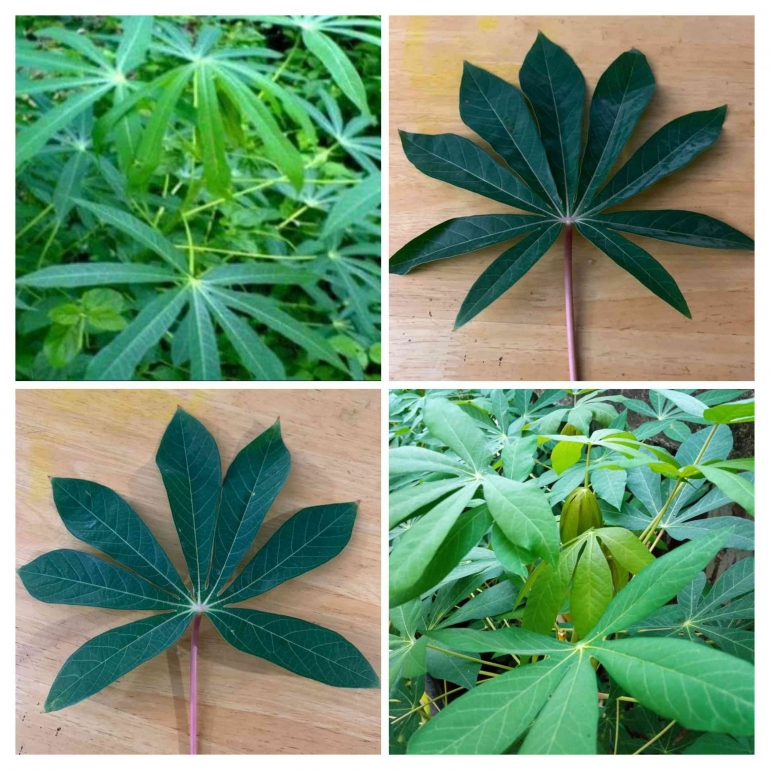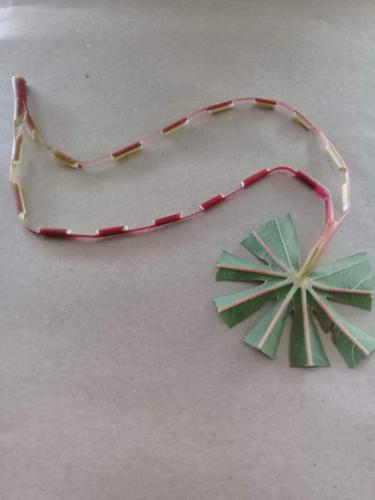 Kalung dari daun singkong, lebih mudah jika menggunakan daun singkong dengan tangkai merah seperti gambar diatas. Paling penting adalah kulit terluarnya (yang berwarna merah) tidak putus. Karena kulit luar itu sebagai penyambung antara satu patahan dengan patahan lainnya. Jika sempat putus, maka ambil satu tangkai daun singkong lagi, lalu kerjakan dengan lebih hati-hati.