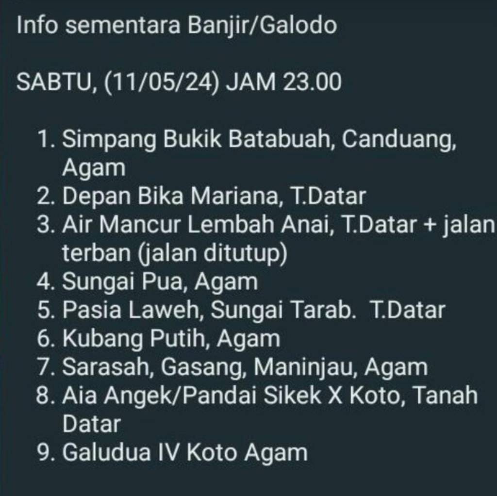 Wilayah yang terdampak dari peristiwa galodo dan banjir besar pada Sabtu,11 Mei 2024