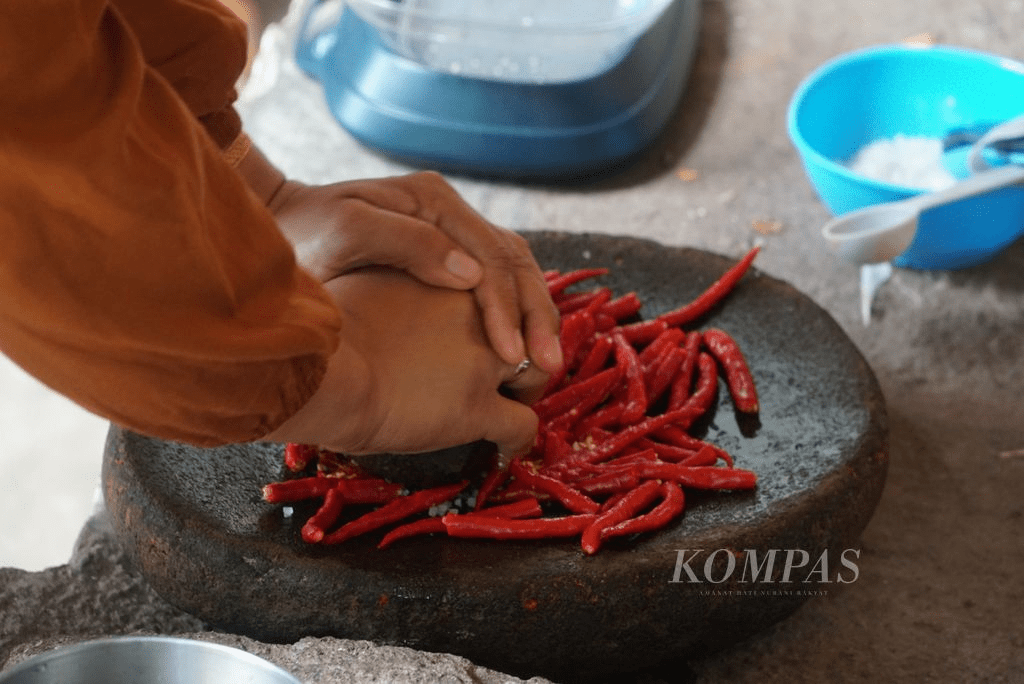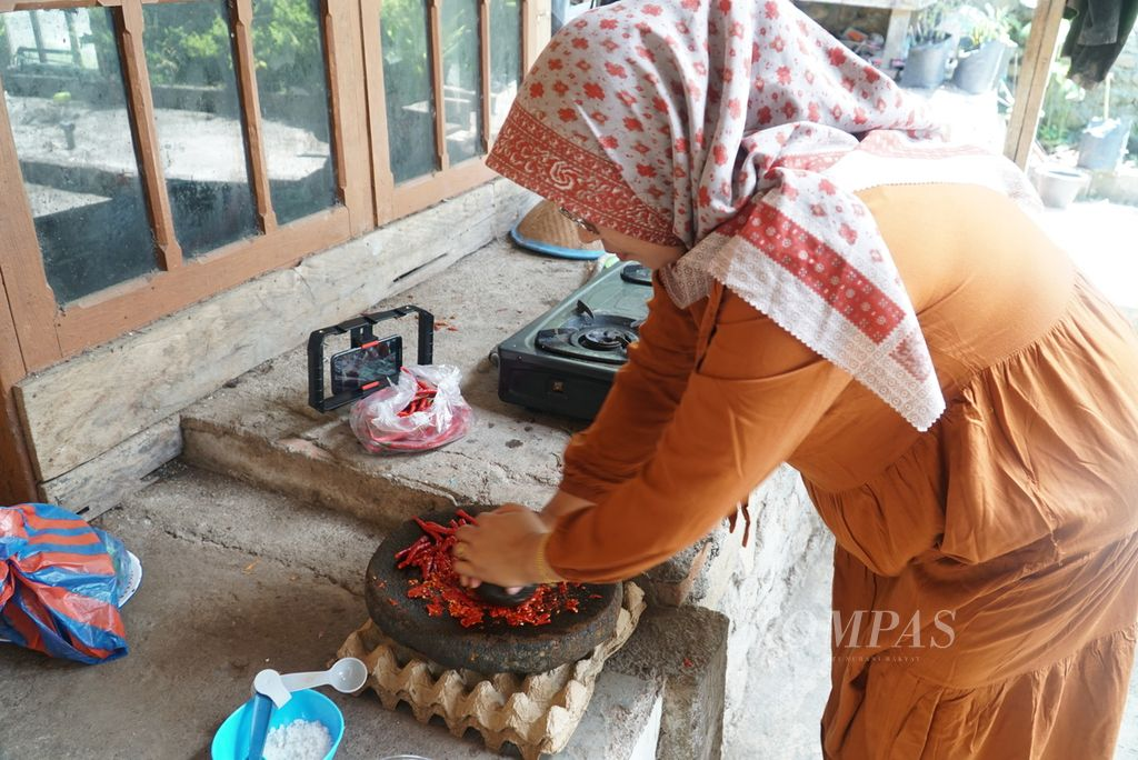 Warga menggiling cabai merah untuk membuat samba lado tulang di Nagari Parambahan, Kecamatan Limo Kaum, Tanah Datar, Sumatera Barat. Samba lado tulang adalah makanan khas masyarakat Tanah Datar.