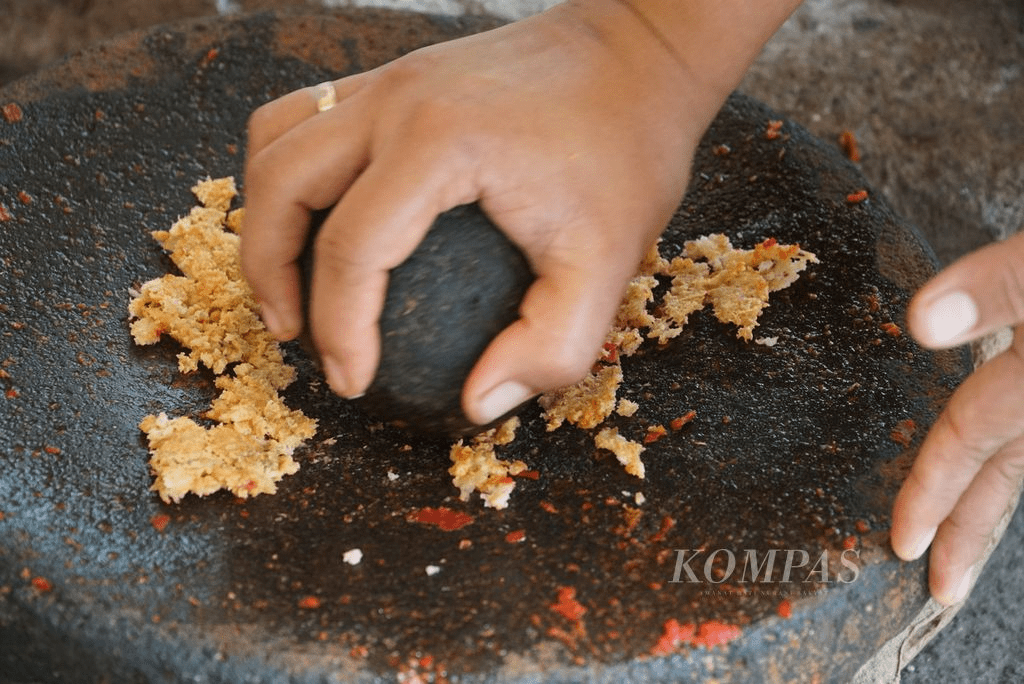 Warga menggiling serutan tulang sapi bagian paha atau kaki serta isi sum-sumnya untuk membuat samba lado tulang di Nagari Parambahan, Kecamatan Limo Kaum, Tanah Datar, Sumatera Barat. Samba lado tulang adalah makanan khas masyarakat Tanah Datar.