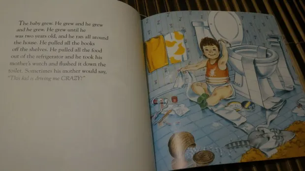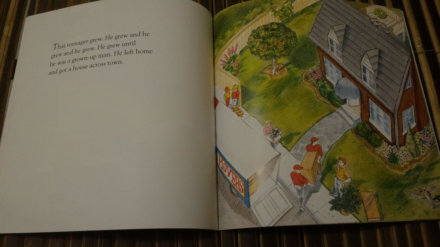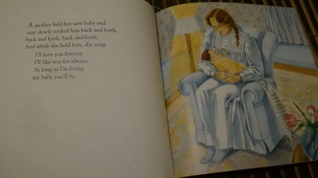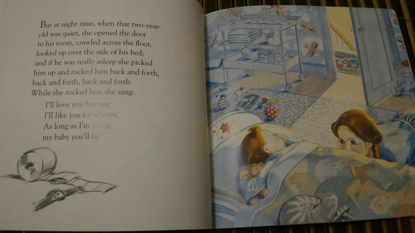 Meskipun kadang-kadang dia merasa kesal karena perilaku putranya pada usia 2 tahun, 9 tahun, dan saat remaja, sang ibu tetap mengunjungi kamar tidur putranya setiap malam untuk menggendongnya, dan menyanyikan lagu pengantar tidur singkat yang berjanji untuk selalu mencintainya: