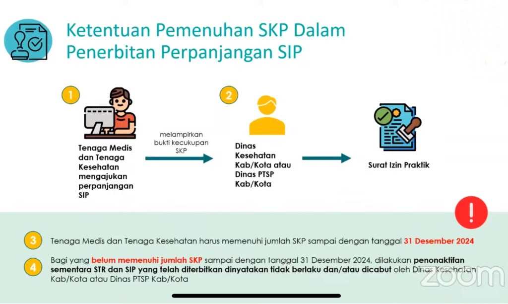 Kementerian Kesehatan RI merelaksasi kebijakan pemenuhan jumlah satuan kredit profesi (SKP) hingga 31 Desember 2023 sebagai syarat perpanjangan surat izin praktik (SIP) dokter gigi maupun tenaga kesehatan lainnya. Hal ini tertuang dalam Surat Edaran nomor HK.02.01/MENKES/1063/2024 tentang Pemenuhan Satuan Kredit Profesi Dalam Penerbitan Perpanjangan Surat Izin Praktik Tenaga Medis dan Tenaga Kesehatan.