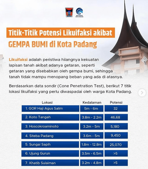 Berdasarkan data sondir (Cone Penetration Test), berikut 7 titik lokasi likuifaksi yang perlu diwaspadai oleh warga Padang.