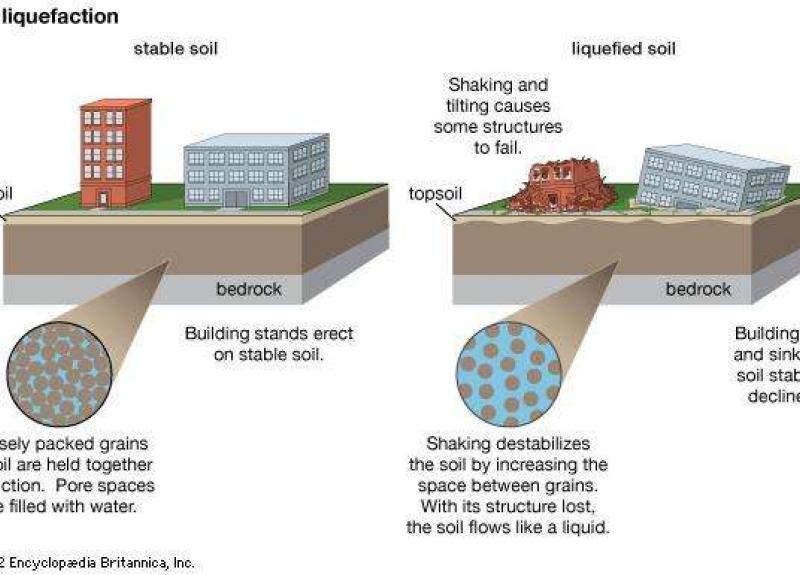 Tanah terdiri dari komponen penyusun dan ruang pori. Ketika goncangan gempa terjadi di tanah yang kaya atau dekat dengan sumber air, ruang pori terebut terisi air sehingga mengurangi volume keseluruhan tanah.