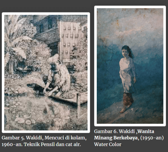 WAKIDI umumnya tidak tertarik untuk menggambarkan manusia. Ada beberapa alasan, Wakidi tidak menguasai teknik menggambar wajah atau memang tidak suka atau “tuntutan lingkungan? Memang, Sebagai pelukis era “Moi Indie” (India Molek) beliau telah diletakkan dalam peta seni lukis Indonesia yang hanya menggambarkan keindahan alam. Uraian di bawah ini bukan untuk menolak pernyataan itu, baguslah ada tokoh seni lukis Indonesia yang tumbuh dan berkembang di tanah Minangkabau (Sumatera Barat). Setidaknya tercatat dalam sejarah seni lukis Indonesia. Oleh karena itu tulisan ini hanyalah sekedar menambah apa yang telah ditulis sebelumnya, namun mungkin ada hal yang baru yang belum terpikirkan oleh orang.