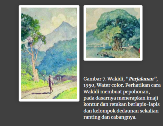 Perspektif. Dalam menggambarkan lanskap alam umumnya Wakidi mengambil sepertiga dari tinggi kanvas sebagai garis horison, beberapa lukisan mengambil garis tengah tetapi itu jarang dilakukan.