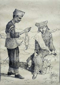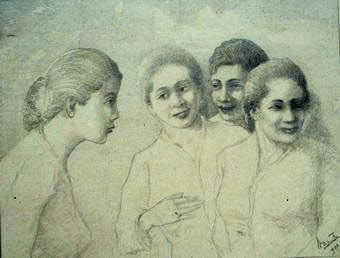 Gambar 5. Wakidi, Mencuci di kolam, 1960-an. Teknik Pensil dan cat air. Gambar 6. Wakidi ,Wanita Minang Berkebaya, (1950-an) Water Color.