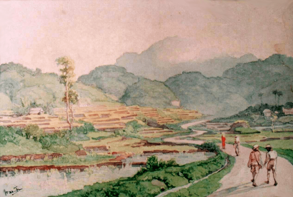 Gambar 7. Wakidi, “Perjalanan”, 1950, Water color. Perhatikan cara Wakidi membuat pepohonan, pada dasarnya menerapkan imaji kontur dan retakan berlapis-lapis dan kelompok dedaunan sekalian ranting dan cabangnya.