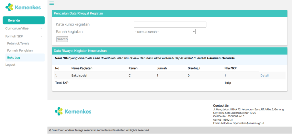 Menu Buku Log untuk melihat data riwayat kegiatan keseluruhan, salah satu contoh pengecekan Kegiatan Bakti Sosial bisa dilihat sudah disetujui atau belum oleh tim verifikasi Kemenkes.