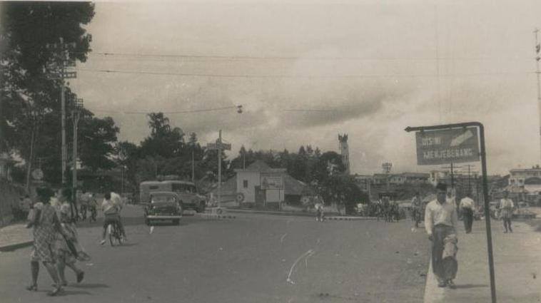 Perkiraan foto antara tahun 1970an – 1980an. Terdapat sebuah lampu pengatur lalu lintas (lampu merah) sebagaimana tampak pada sisi sebalah kanan dua buah tiang kecil yang dicat kuning dan hitam. Serta zebra cross yang mulai memudar dan seorang pengendara motor dengan helm proyek.
