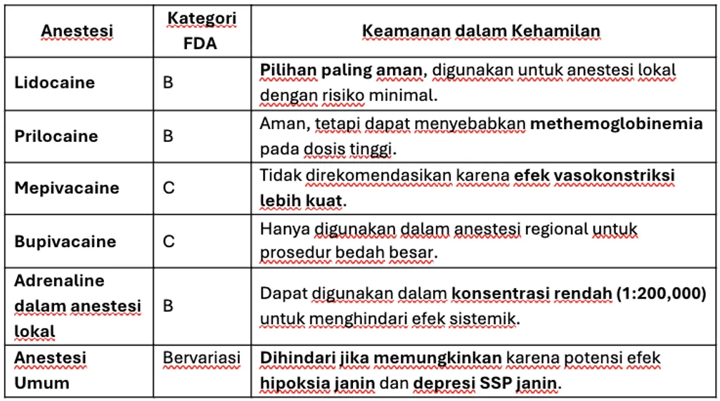 Anestesi lokal adalah pilihan utama dalam bidang bedah mulut selama kehamilan. Namun, perlu diperhatikan jenis agen anestesi dan konsentrasi epinefrin untuk menghindari efek sistemik yang dapat memengaruhi janin.