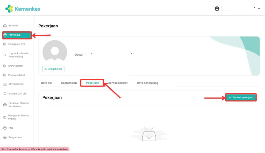 d. Masuk ke menu “Profil Saya”, klik “Pekerjaan” dan klik “Tambah Pekerjaan” saat ini jika belum ada.