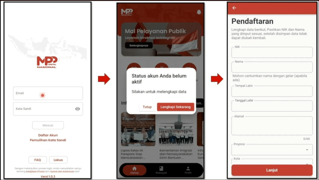 d. Masuk dengan akun yang sudah terdaftar. Akan muncul popup untuk aktivasi akun, klik “Lengkapi Sekarang” dan isi data yang dibutuhkan kemudian klik “Lanjut”