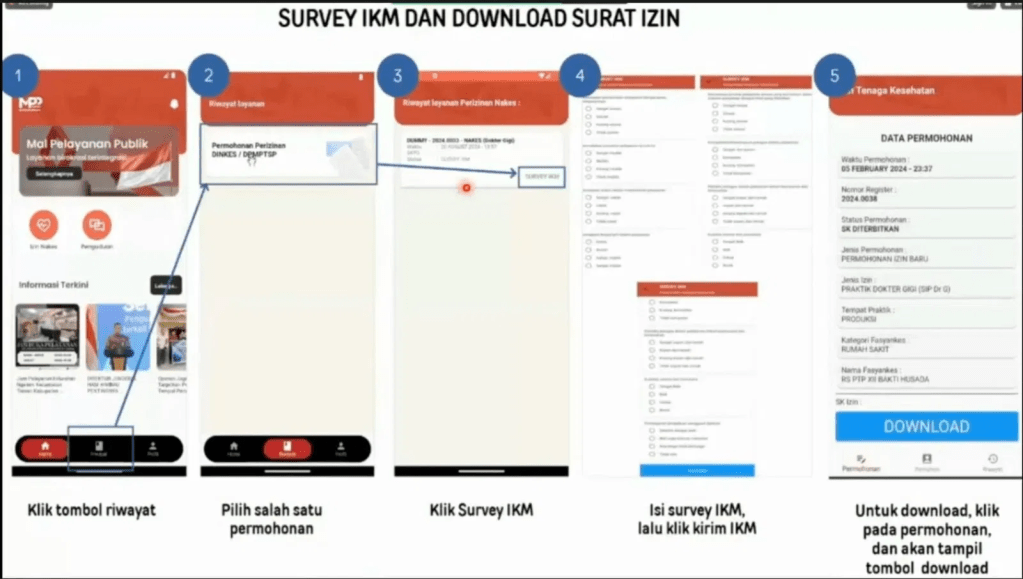 g. Cek status pengajuan melalui Beranda “Riwayat”, klik “Permohonan Perizinan Dinkes”. Jika sudah selesai akan muncul status “Survey IKM”. Setelah selesai mengisi survey SIP bisa didownload.
