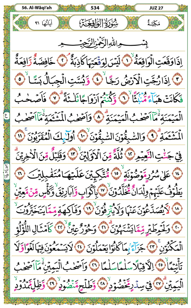 Surat Al-Waqiah adalah surat ke-56 dalam Al-Qur’an yang terdiri dari 96 ayat. Surat ini termasuk golongan surat Makkiyah karena diturunkan di Makkah. Al-Waqiah terletak pada juz ke-27. Nama “Al-Waqiah” diambil dari lafaz dalam ayat pertama surat ini, yang berarti “hari kiamat.”
