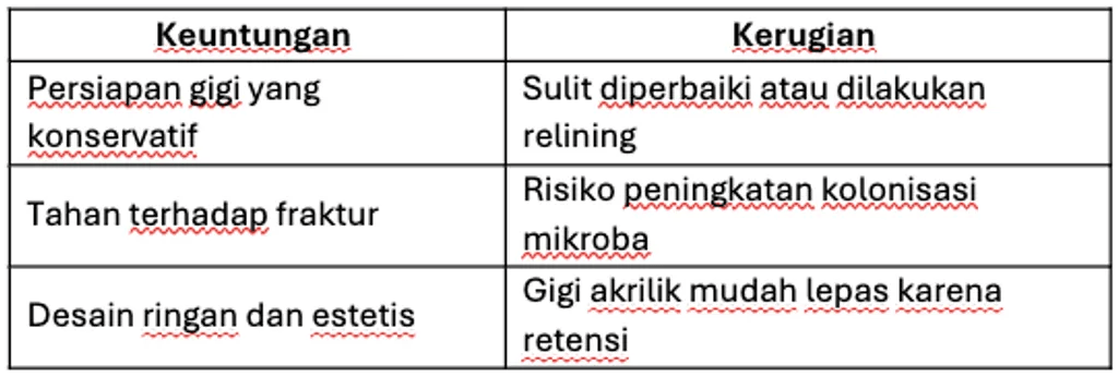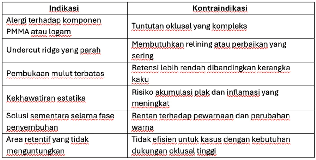 - Hindari pada kasus dengan gaya oklusal yang tinggi atau kebutuhan relining di masa mendatang.