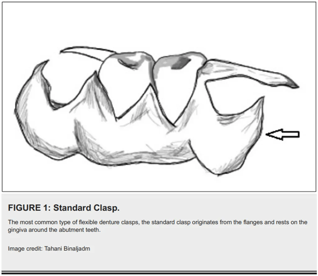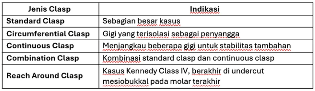 - Figur 1: Standard Clasp – Berasal dari sayap dan bertumpu pada gingiva di sekitar gigi abutment.