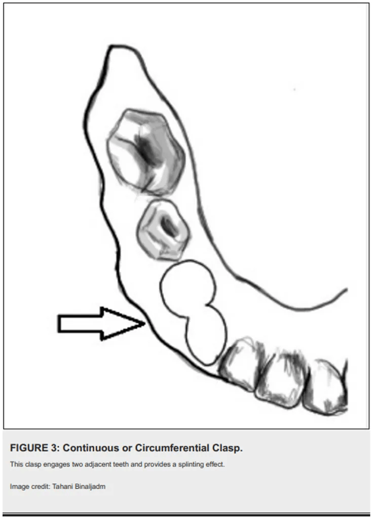 - Figur 3: Continuous Clasp – Menjangkau dua gigi berdekatan untuk stabilitas tambahan.