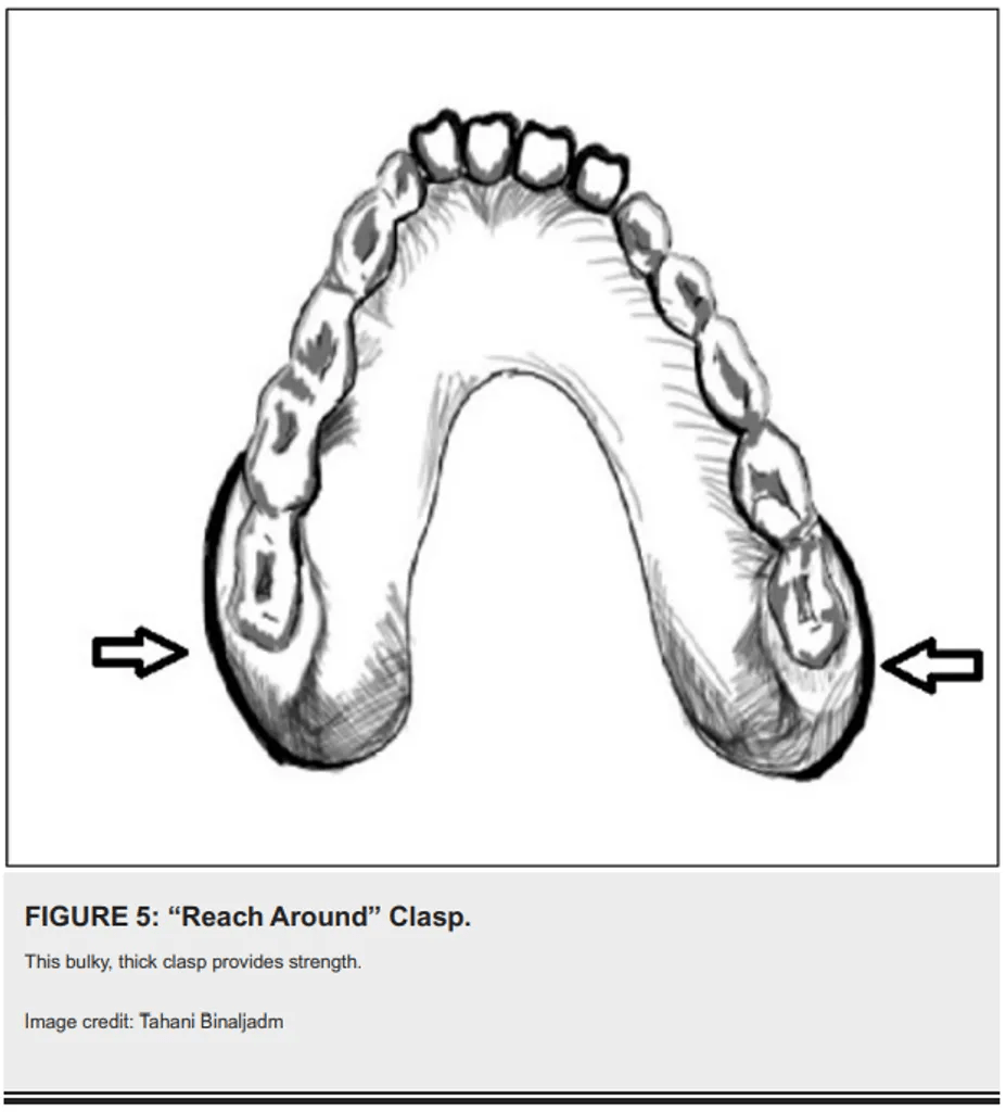 - Figur 5: Reach Around Clasp – Dirancang untuk Kennedy Class IV, berakhir di undercut mesiobukkal molar terakhir.