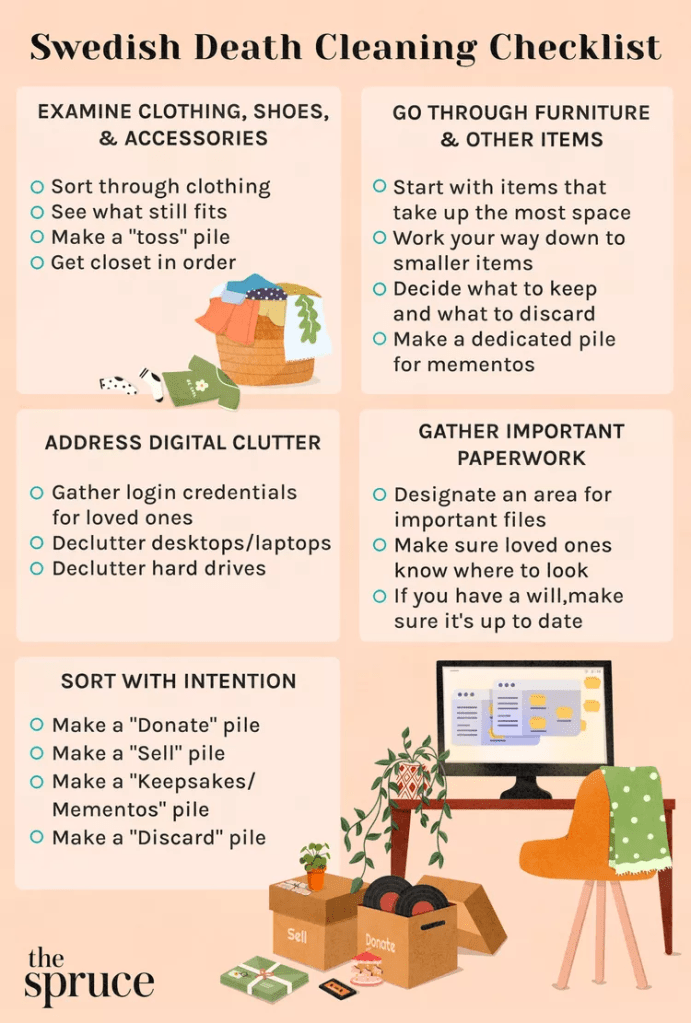 Secara praktis, ini berarti mengatur dan merapikan rumah Anda untuk mengurangi beban memilah-milah lusinan barang dan mencoba memutuskan mana yang penting. Dengan metode pembersihan ala Swedia (Swedish death cleaning), Anda sudah melakukan itu untuk mereka dengan hanya menyimpan barang-barang yang telah Anda tentukan sebagai barang penting.
