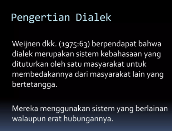 Dialek adalah sistem kebahasaan yang dituturkan oleh suatu masyarakat untuk membedakannya dari masyarakat lain yang bertetangga, menurut pandangan Weijnen dkk. Ini adalah definisi yang merujuk pada variasi bahasa yang digunakan oleh kelompok penutur di wilayah tertentu, yang mencakup perbedaan dalam pelafalan, kosakata, dan tata bahasa.