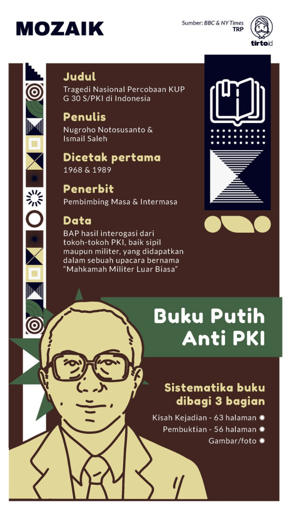 Mari membuka buku Nugroho Notosusanto yang meninggal pada 3 Juni 1985, tepat hari ini 37 tahun lalu, dan Ismail Saleh, Tragedi Nasional: Percobaan Kup G 30 S/PKI di Indonesia. Buku ini dicetak pertama kali Pembimbing Masa pada 1968. Dalam cetak ulangnya pada 1989 berganti penerbit menjadi Intermasa.