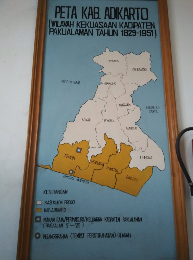 Jadi sejak 1813, Sebuah Kadipaten berdiri di Wilayah Kesultanan, bernama Pakualaman. Kratonnya berada di timur wilayah Kraton Yogyakarta atau biasa disebut Pura Pakualaman, wilayahnya? Enclave yang kini menjadi Kecamatan Pakualaman di Kota Yogya, dan 6 daerah di selatan daerah di barat Kali Progo, bernama Kabupaten ADIKARTO. Secara garis besar meliputi : Sogan, Temon, Panjatan, Brosot , Galur dan pusatnya di Wates.
