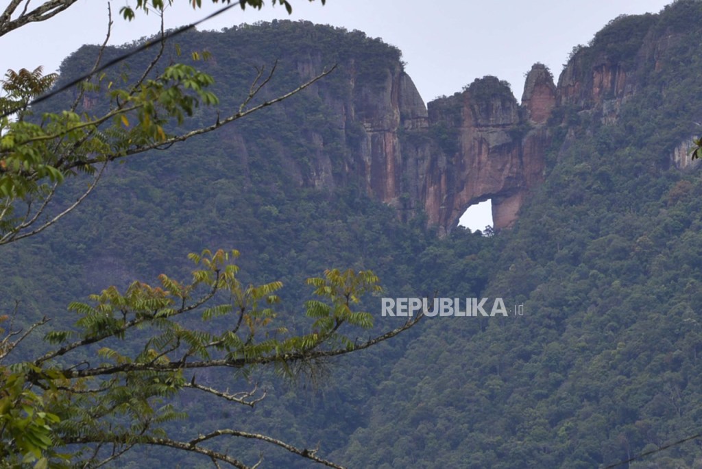 Begitu memasuki Jorong Kotogodang Maek, saya langsung dapat melihat sebuah bukit membentang di ujung timur laut sana. Uniknya, pada bagian atas bukit itu terdapat bolongan berbentuk pola seperempat lingkaran seperti habis ditusuk oleh sesuatu, sehingga dari celah tersebut tampak secuil warna biru langit di baliknya.