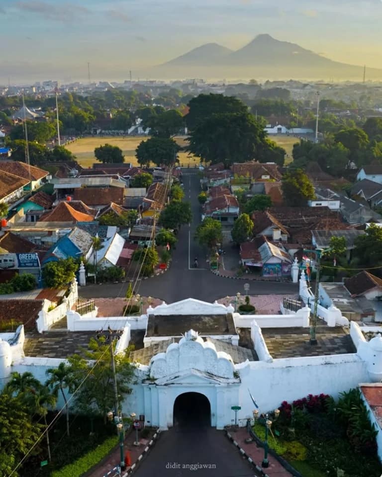 Plengkung Nirbaya/Gading difoto dari selatan (perempatan gading), dengan latar belakang alun2 kidul, kraton dan Merapi di kejauhan