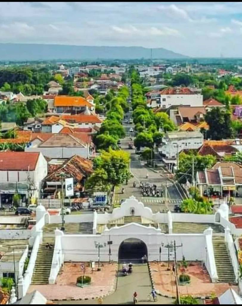 Plengkung Nirbaya/Gading difoto dari utara (jalan Gading), dengan latar belakang perempatan Gading dan Jalan Ngadinegaran (DI Panjaitan) ke arah Panggung Krapyak. Di kejauhan tampak pegunungan selatan.
